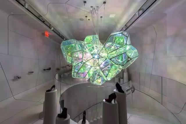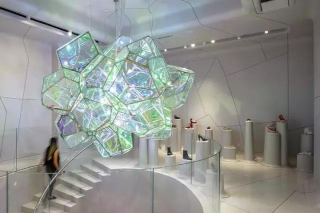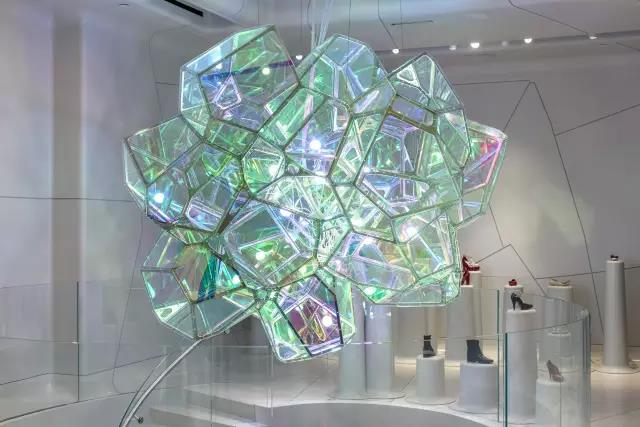 這件作品是SOFTlab與Melissa合作為其紐約曼哈頓門店設(shè)計的主題為“ Star Walker ”的裝置作品,為顧客營造出了一個賞心悅目的購物環(huán)境。裝置是由水晶制成,每一塊都好似水晶的切割面,閃爍著五彩的光暈。這些水晶裝置分布在店內(nèi)不同的地方,都是由天花板垂下,遠看就像是萬花筒中的琉璃花。