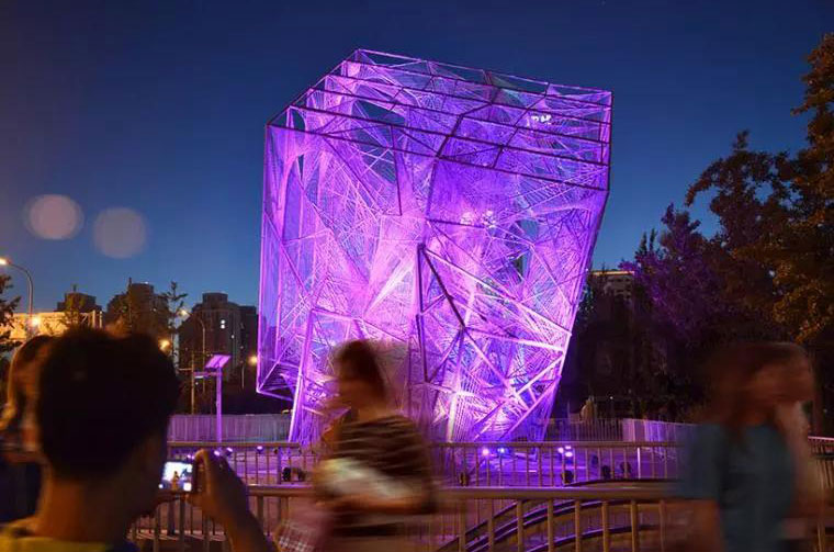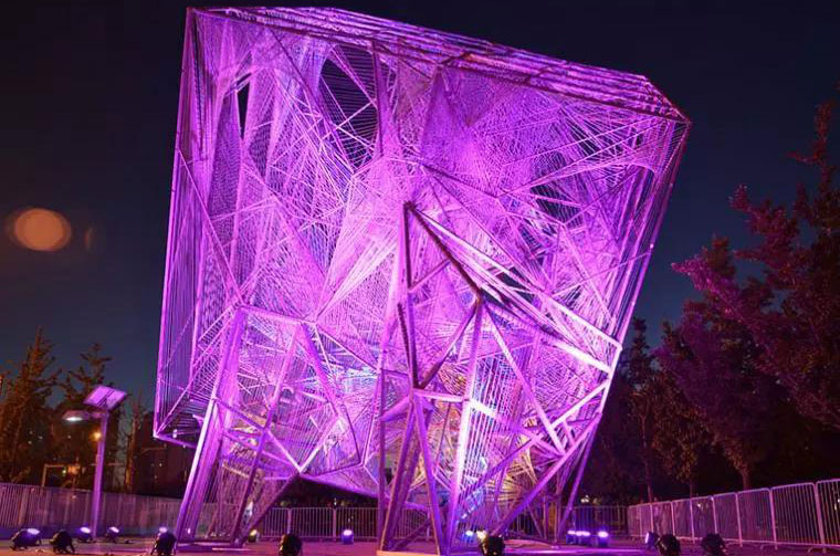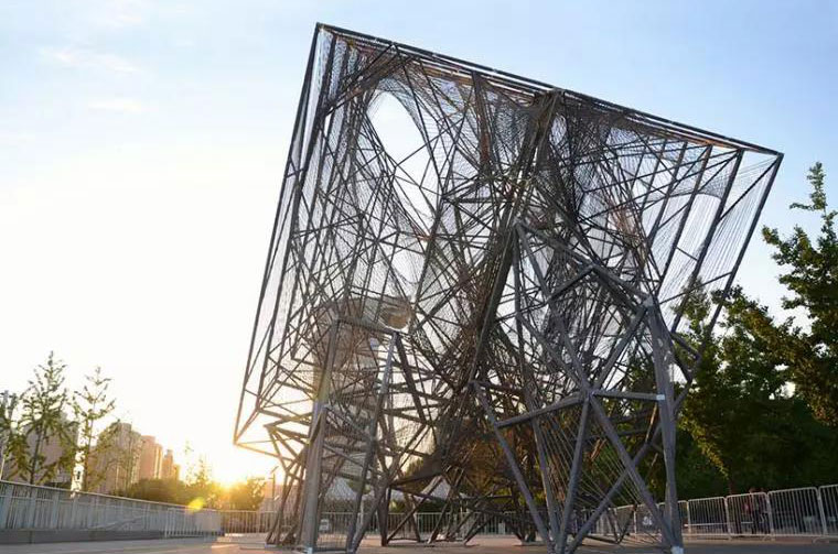 “線立方”是參加2013年中國國際建筑藝術雙年展的作品之一,展覽地點位于中國北京國際體育場附近,是由來自洛杉磯的Oyler Wu聯(lián)合設計,整個構(gòu)筑物約16米高,像一個三維編織的掛毯,整體架構(gòu)全部由金屬框架支撐,而且提供了與眾不同的感官體驗,整個結(jié)構(gòu)從各個角度觀賞有不同的變化。