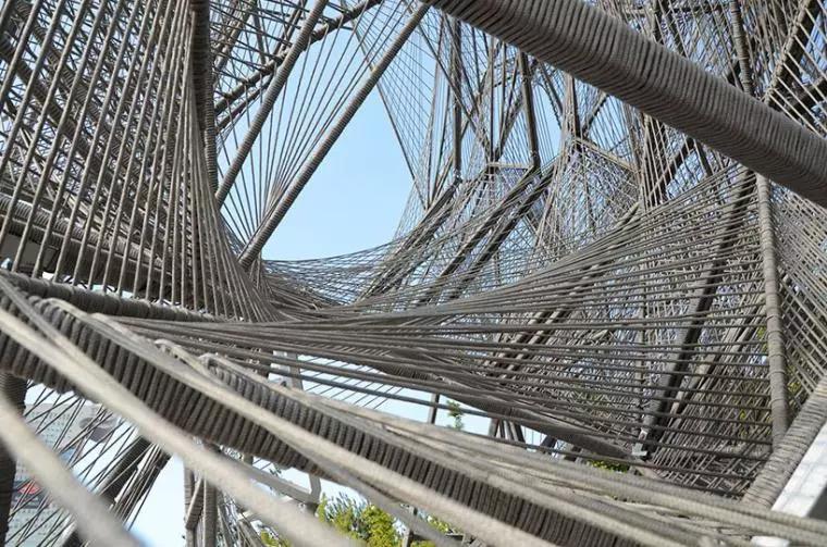 設計源于6個簡單框架的扭曲與組合,每個框架中都包含一個二維組合制成的繩子,通過建立橫向軸、類似編織品的連接方式來增加整個結(jié)構(gòu)的深度和空間,并在某種程度上突破了多維數(shù)據(jù),建立了一些不穩(wěn)定的角。